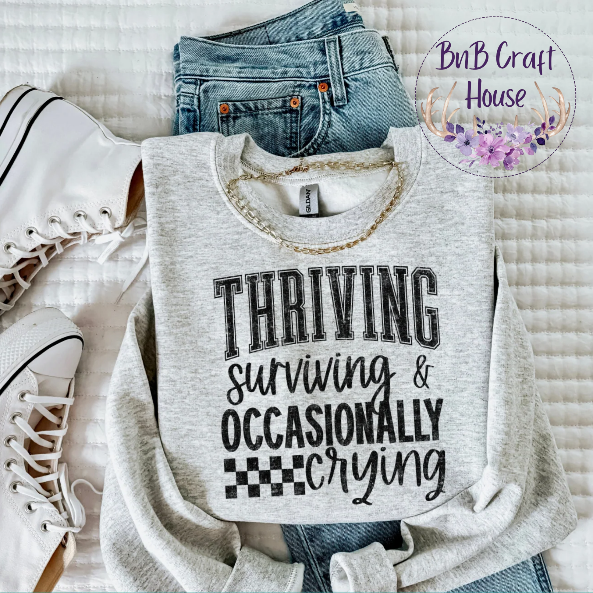 For the ones doing their best with a smile (and maybe a tear or two). This Thriving, Surviving & Occasionally Crying sweatshirt is the perfect blend of humor and honesty — cozy, cute, and totally relatable. Made with soft, durable fabric, it’s the go‑to piece for busy days, self‑care nights, and everything in between.